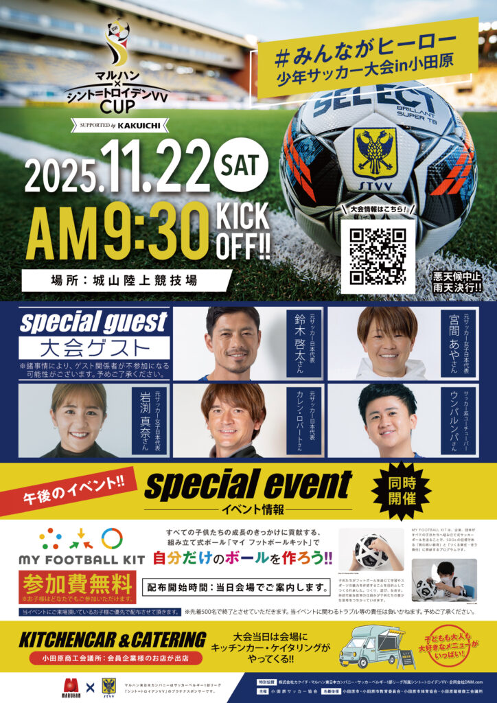 「マルハン×シント=トロイデンVVカップsupported by KAKUICHI」は小学校4年生以下の年代で行われる少年サッカー大会で、小田原市サッカー協会に登録された小田原市を中心に活動しているフットボールクラブ計14チームが参加予定です。特別ゲストとして、元サッカー日本代表の鈴木啓太氏・カレン・ロバート氏、元サッカー女子日本代表の宮間あや氏・岩渕真奈氏、サッカー系Youtuberのウンパルンパ氏も来場予定です。