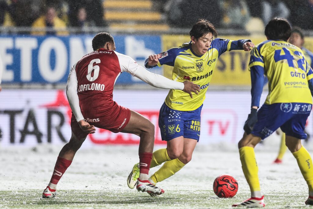 ◆前半最初のチャンスはズルテ・ワレヘム。3分、相手MFがゴール前でシュートを放つも、小久保がファインセーブで得点を許さない。7分には、伊藤がペナルティエリア内でフリーの状態からシュートを放つが、こちらも相手GKの好守に阻まれ、ゴールとはならなかった。雪の影響でボールをつなぐことが難しく、両チームともロングボールを多用する展開となる。